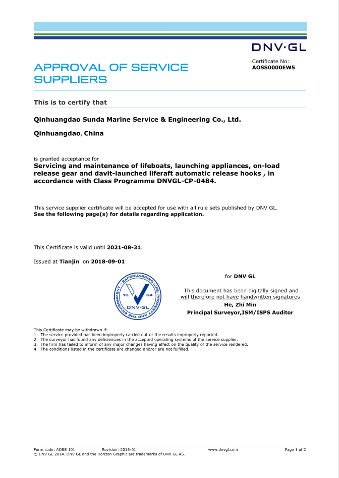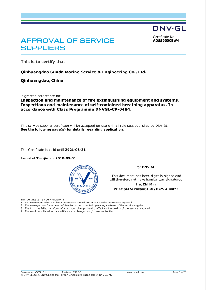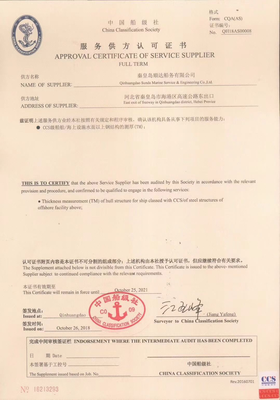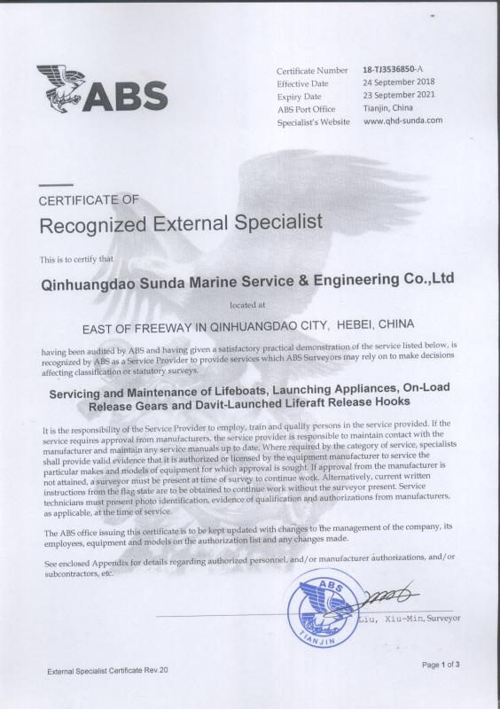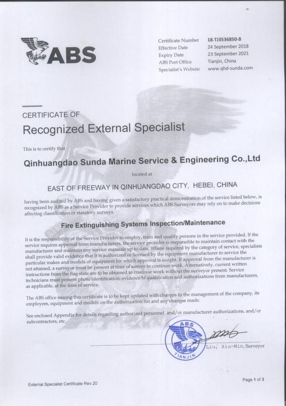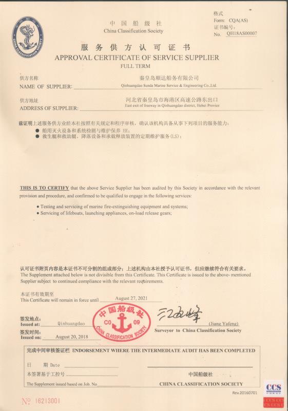 秦皇島順達(dá)船務(wù)有限公司位于美麗的海濱城市、中國北方著名的能源輸出大港--秦皇島。公司從事于船舶修理、物料供應(yīng)、水下檢測、船體測厚、消防救生設(shè)備及救生艇檢驗(yàn)、電氣自動(dòng)化修理等服務(wù)。 公司自1997年成立至今,先后為國內(nèi)外船東修理、檢驗(yàn)各類船舶萬余艘,積累了豐富的施工經(jīng)驗(yàn)。公司現(xiàn)有場地100余畝,員工30余人,以及工程用車若干臺(tái)。我們公司一直本著嚴(yán)以律己、真誠待人、精益求精、信譽(yù)至上的經(jīng)營理念,以優(yōu)質(zhì)的服務(wù)、專業(yè)的施工、合理的收費(fèi),得到了國內(nèi)外船東的廣泛認(rèn)可,贏得了良好的口碑和信譽(yù)。 公司已取得了中國船級(jí)社(CCS)、美國船級(jí)社(ABS)、日本船級(jí)社(NK)、德國船級(jí)社(DNV GL)等各個(gè)船級(jí)社的消防救生和救生艇檢驗(yàn)資質(zhì), ...